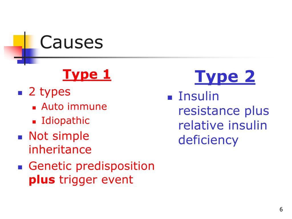 Causes Type 1 • 2 types • Auto immune • Idiopathic • Not simple inheritance • Genetic predisposition plus trigger event Type 2 • Insulin resistance plus relative insulin deficiency