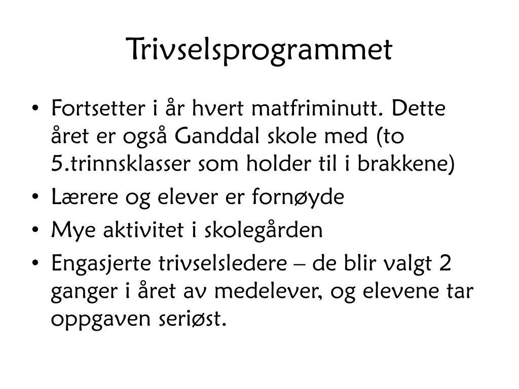 Trivselsprogrammet • Fortsetter i år hvert matfriminutt. Dette året er også Ganddal skole med (to 5.trinnsklasser som holder til i brakkene) • Lærere og elever er fornøyde • Mye aktivitet i skolegården • Engasjerte trivselsledere – de blir valgt 2 ganger i året av medelever, og elevene tar oppgaven seriøst.