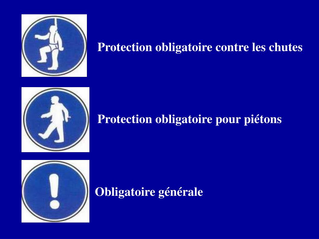 Protection obligatoire contre les chutes Protection obligatoire pour piétons Obligatoire générale
