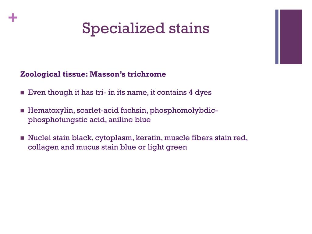 Specialized stains Zoological tissue: Masson’s trichrome • Even though it has tri- in its name, it contains 4 dyes • Hematoxylin, scarlet-acid fuchsin, phosphomolybdic-phosphotungstic acid, aniline blue • Nuclei stain black, cytoplasm, keratin, muscle fibers stain red, collagen and mucus stain blue or light green