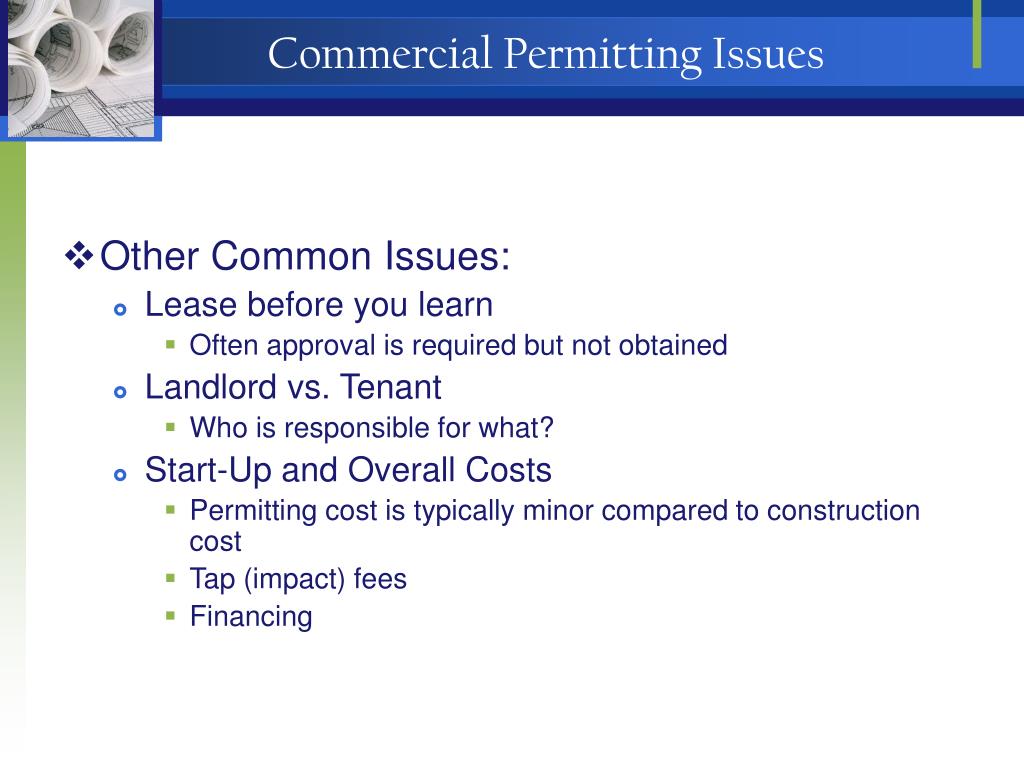 Commercial Permitting Issues • Other Common Issues: • Lease before you learn • Often approval is required but not obtained • Landlord vs. Tenant • Who is responsible for what? • Start-Up and Overall Costs • Permitting cost is typically minor compared to construction cost • Tap (impact) fees • Financing