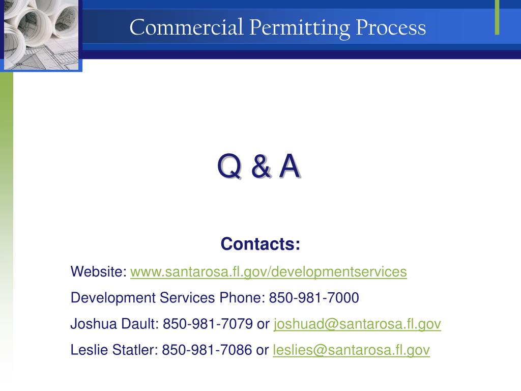 Commercial Permitting Process Q & A Contacts: Website: www.santarosa.fl.gov/developmentservices Development Services Phone: 850-981-7000 Joshua Dault: 850-981-7079 or joshuad@santarosa.fl.gov Leslie Statler: 850-981-7086 or leslies@santarosa.fl.gov