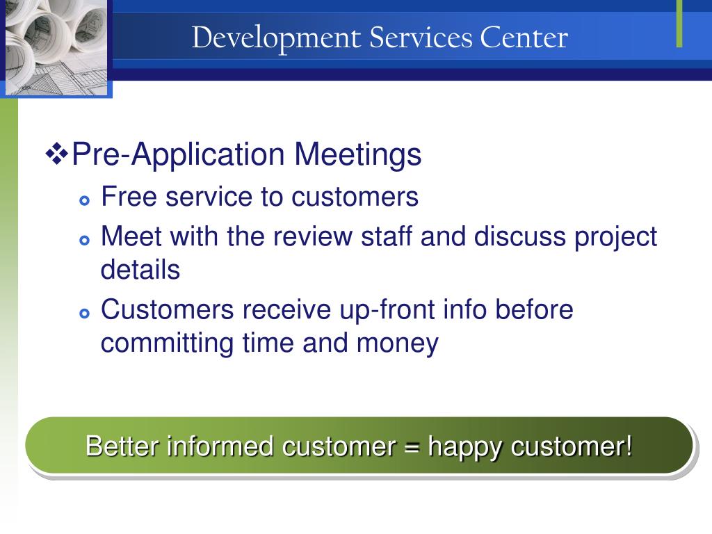 Development Services Center • Pre-Application Meetings • Free service to customers • Meet with the review staff and discuss project details • Customers receive up-front info before committing time and money Better informed customer = happy customer!