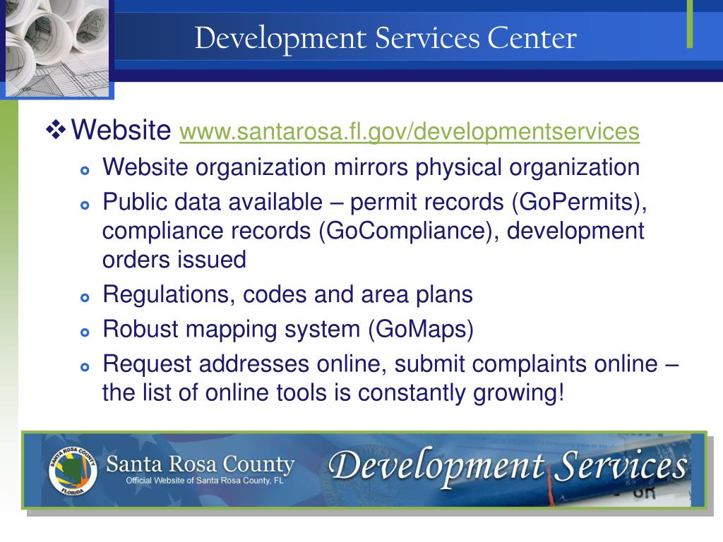 Development Services Center • Website www.santarosa.fl.gov/developmentservices • Website organization mirrors physical organization • Public data available – permit records (GoPermits), compliance records (GoCompliance), development orders issued • Regulations, codes and area plans • Robust mapping system (GoMaps) • Request addresses online, submit complaints online – the list of online tools is constantly growing!