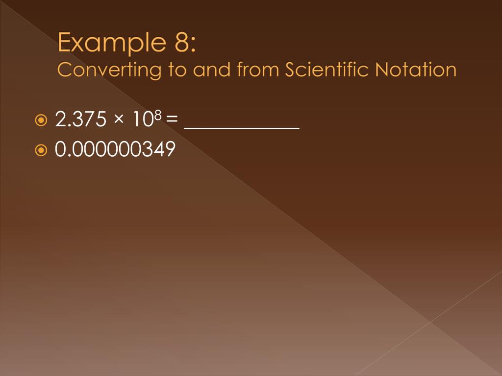 Example 8:Converting to and from Scientific Notation • 2.375 × 108 = ___________ • 0.000000349