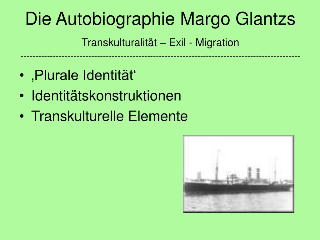 Die Autobiographie Margo GlantzsTranskulturalität – Exil - Migration----------------------------------------------------------------------------------------------- • ‚Plurale Identität‘ • Identitätskonstruktionen • Transkulturelle Elemente
