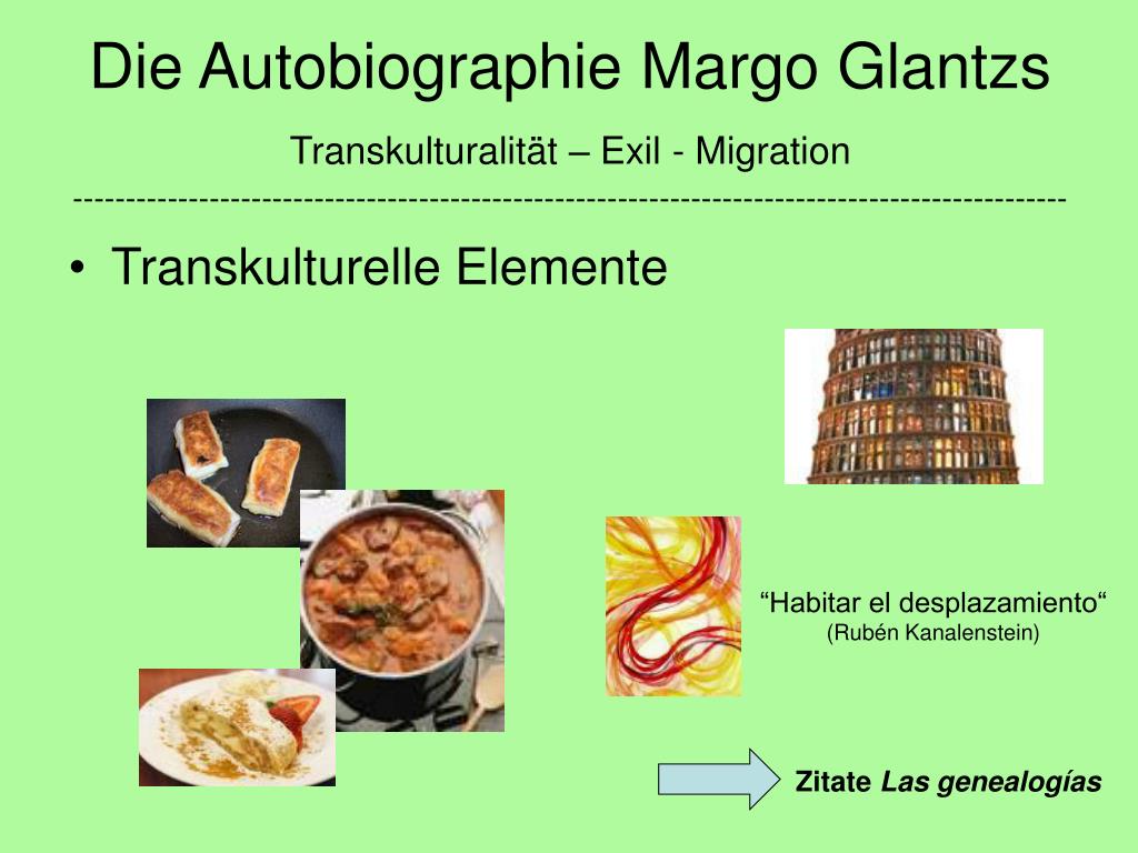Die Autobiographie Margo GlantzsTranskulturalität – Exil - Migration----------------------------------------------------------------------------------------------- • Transkulturelle Elemente “Habitar el desplazamiento“ (Rubén Kanalenstein) Zitate Las genealogías