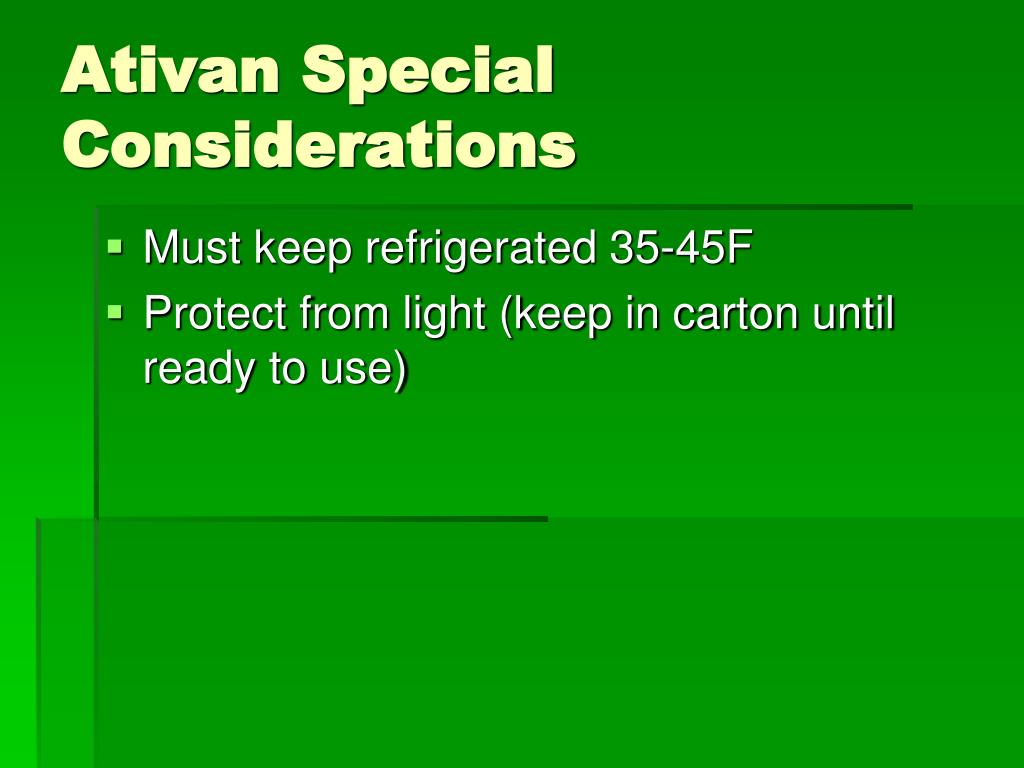 Ativan Special Considerations • Must keep refrigerated 35-45F • Protect from light (keep in carton until ready to use)