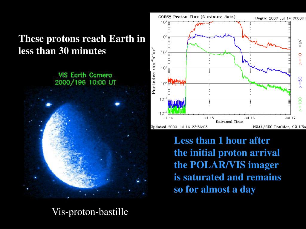 These protons reach Earth in less than 30 minutes Less than 1 hour after the initial proton arrival the POLAR/VIS imager is saturated and remains so for almost a day Vis-proton-bastille