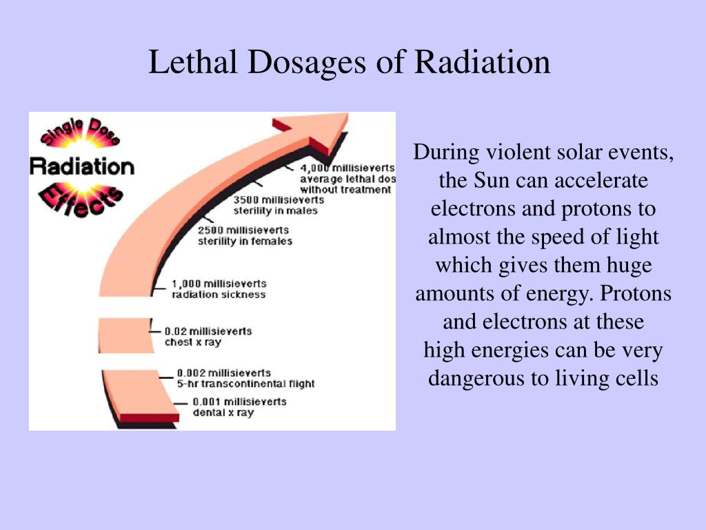 Lethal Dosages of Radiation During violent solar events, the Sun can accelerate electrons and protons to almost the speed of light which gives them huge amounts of energy. Protons and electrons at these high energies can be very dangerous to living cells