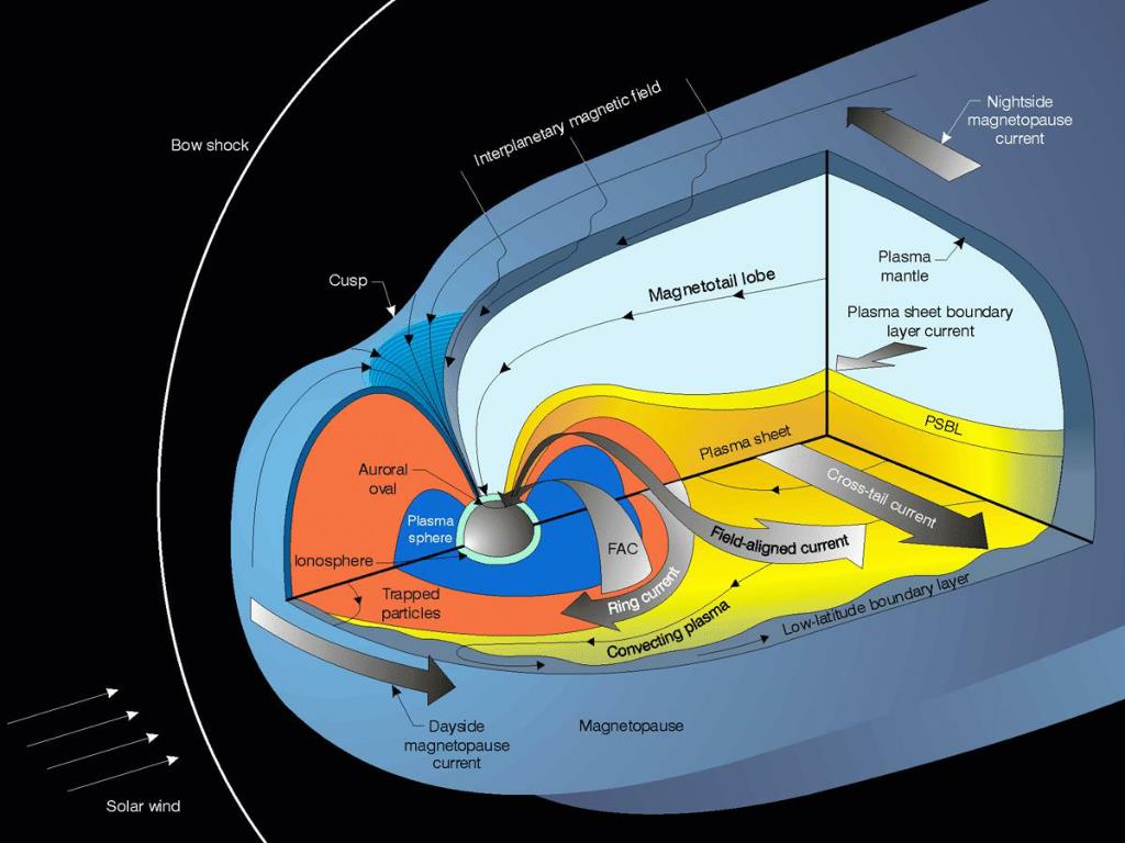 The Earth’s Magnetosphere Energetic electrons and protons are not able to penetrate down to the Earth’s surface directly. Particles gain entry through the cusps that are shaped like funnels over the polar regions or they enter far downstream from the Earth. Particles that enter downstream can be transported toward the Earth and accelerated to high energies, producing auroras and radiation belts.