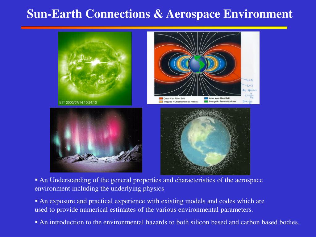 Sun-Earth Connections & Aerospace Environment • An Understanding of the general properties and characteristics of the aerospace environment including the underlying physics • An exposure and practical experience with existing models and codes which are used to provide numerical estimates of the various environmental parameters. • An introduction to the environmental hazards to both silicon based and carbon based bodies.