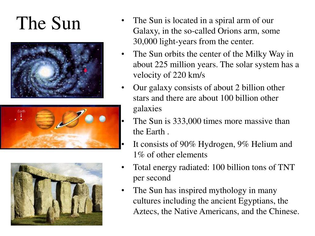 The Sun • The Sun is located in a spiral arm of our Galaxy, in the so-called Orions arm, some 30,000 light-years from the center. • The Sun orbits the center of the Milky Way in about 225 million years. The solar system has a velocity of 220 km/s • Our galaxy consists of about 2 billion other stars and there are about 100 billion other galaxies • The Sun is 333,000 times more massive than the Earth . • It consists of 90% Hydrogen, 9% Helium and 1% of other elements • Total energy radiated: 100 billion tons of TNT per second • The Sun has inspired mythology in many cultures including the ancient Egyptians, the Aztecs, the Native Americans, and the Chinese.