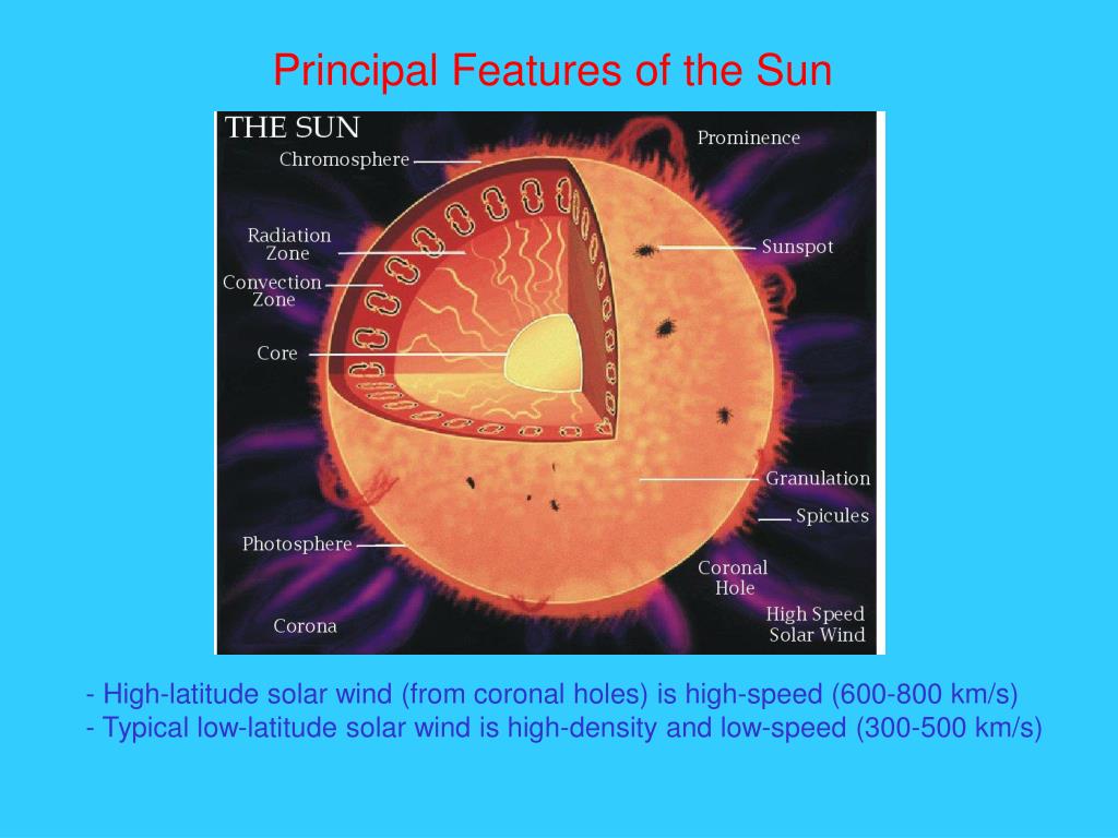Principal Features of the Sun - High-latitude solar wind (from coronal holes) is high-speed (600-800 km/s) - Typical low-latitude solar wind is high-density and low-speed (300-500 km/s)