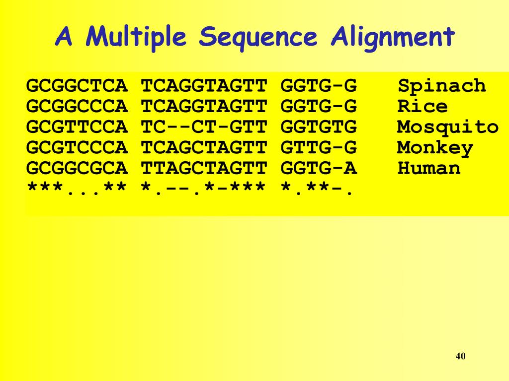 A Multiple Sequence Alignment GCGGCTCA TCAGGTAGTT GGTG-G Spinach GCGGCCCA TCAGGTAGTT GGTG-G Rice GCGTTCCA TC--CT-GTT GGTGTG Mosquito GCGTCCCA TCAGCTAGTT GTTG-G Monkey GCGGCGCA TTAGCTAGTT GGTG-A Human ***...** *.--.*-*** *.**-.