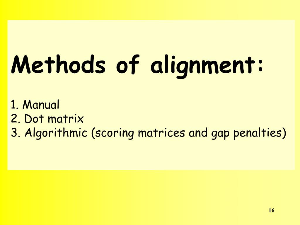 Methods of alignment:1. Manual2. Dot matrix3. Algorithmic (scoring matrices and gap penalties)