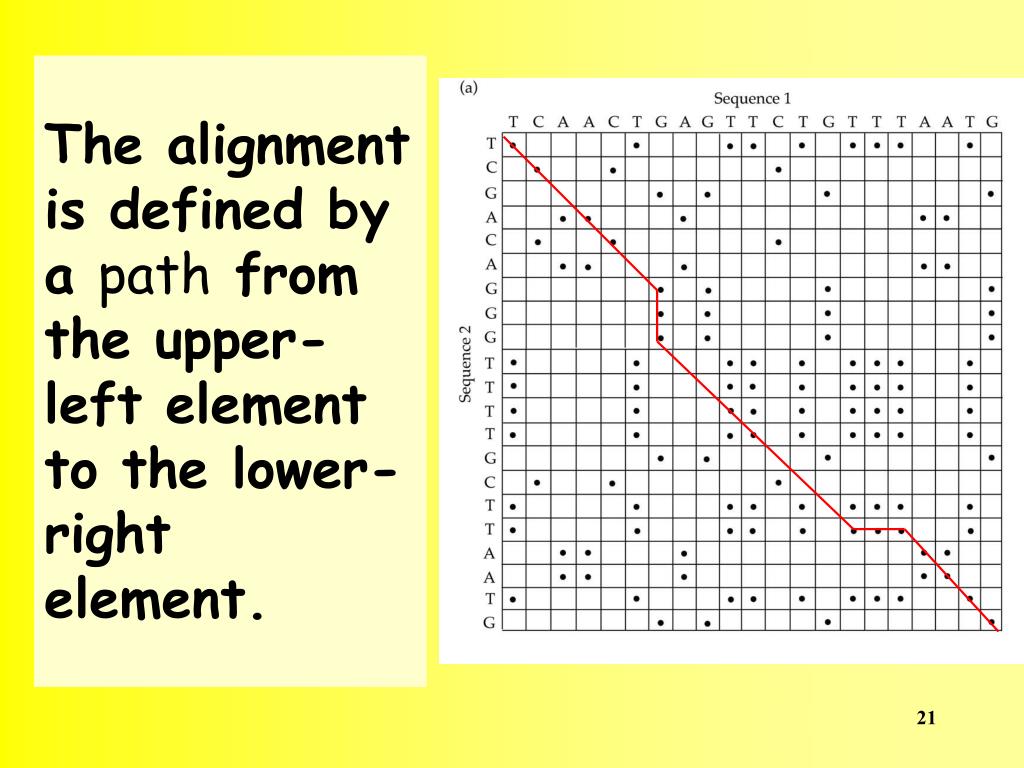 There are 4 possible steps in the path: (1) a diagonal step through a dot = match. (2) a diagonal step through an empty element of the matrix = mismatch. (3) a horizontal step = a gap in the sequence on the top of the matrix. (4) a vertical step = a gap in the sequence on the left of the matrix.