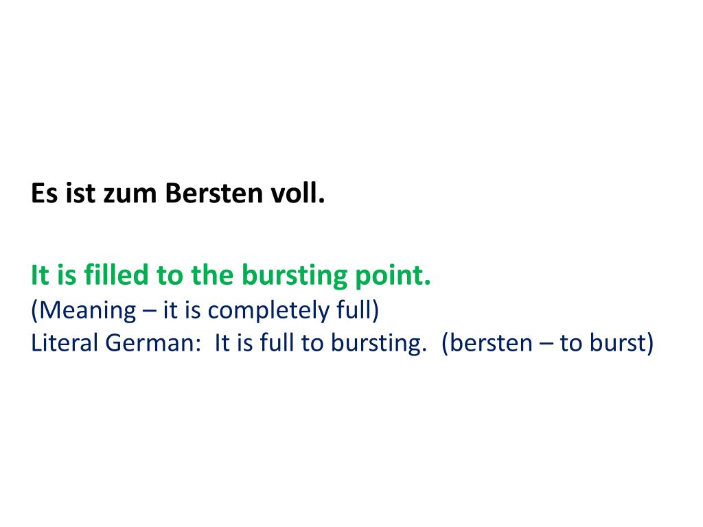 Es istzumBerstenvoll. It is filled to the bursting point. (Meaning – it is completely full) Literal German: It is full to bursting. (bersten – to burst)