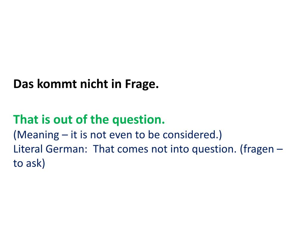 Das kommtnicht in Frage. That is out of the question. (Meaning – it is not even to be considered.) Literal German: That comes not into question. (fragen – to ask)
