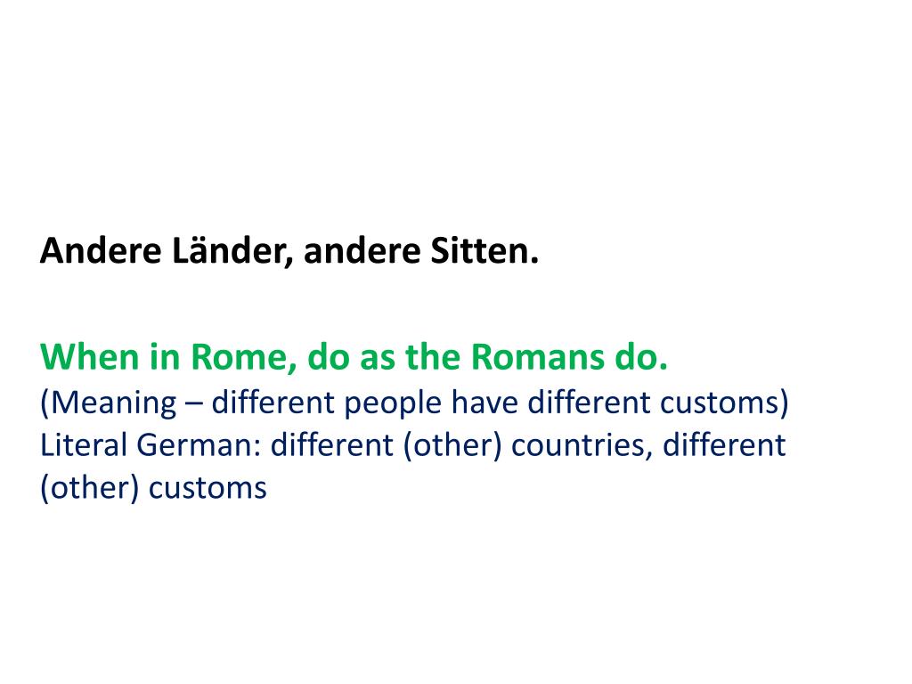 AndereLänder, andereSitten. When in Rome, do as the Romans do. (Meaning – different people have different customs) Literal German: different (other) countries, different (other) customs