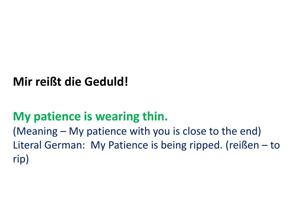 Mir reißt die Geduld! My patience is wearing thin. (Meaning – My patience with you is close to the end) Literal German: My Patience is being ripped. (reißen – to rip)