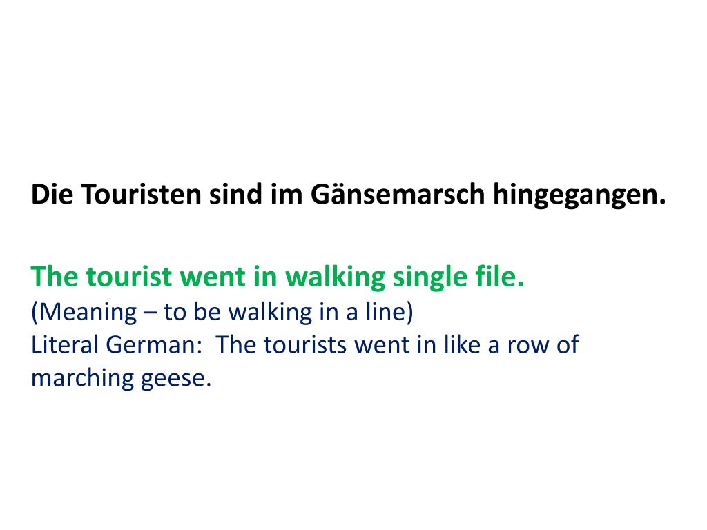 Die TouristensindimGänsemarschhingegangen. The tourist went in walking single file. (Meaning – to be walking in a line) Literal German: The tourists went in like a row of marching geese.
