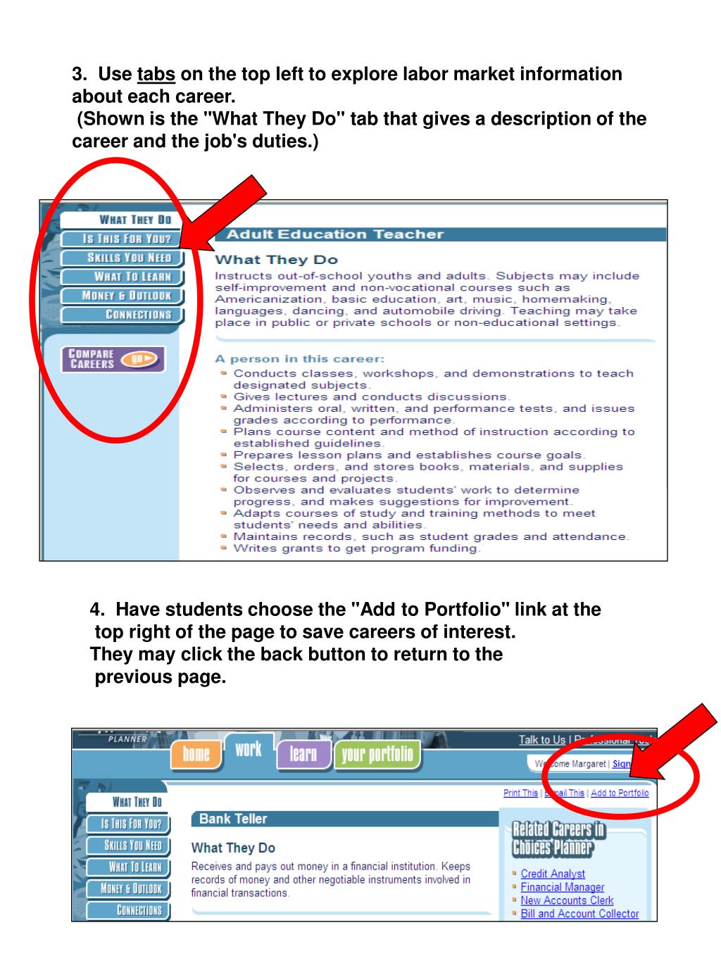 3. Use tabs on the top left to explore labor market information about each career. (Shown is the "What They Do" tab that gives a description of the career and the job's duties.) 4. Have students choose the "Add to Portfolio" link at the top right of the page to save careers of interest. They may click the back button to return to the previous page.