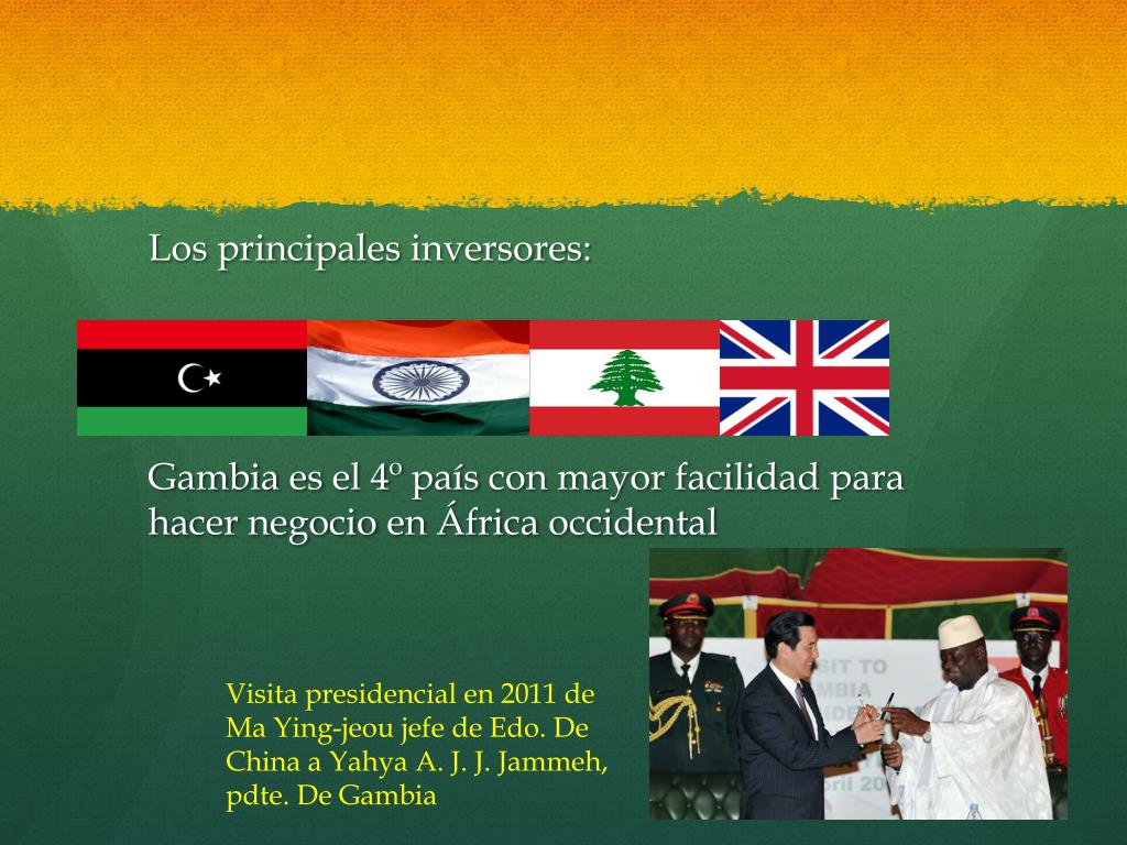 Los principalesinversores: Gambia es el 4º país con mayor facilidadparahacernegocio en Áfricaoccidental Visitapresidencial en 2011 de Ma Ying-jeoujefe de Edo. De China a Yahya A. J. J. Jammeh, pdte. De Gambia