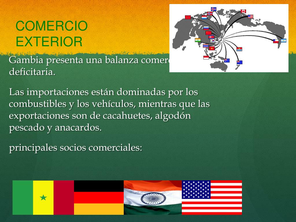 COMERCIO EXTERIOR Gambia presentaunabalanzacomercialdeficitaria. Las importacionesestándominadaspor los combustibles y los vehículos, mientrasquelasexportaciones son de cacahuetes, algodónpescado y anacardos. principalessocioscomerciales: