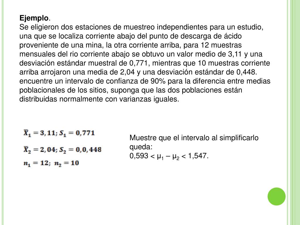 Ejemplo. Se eligieron dos estaciones de muestreo independientes para un estudio, una que se localiza corriente abajo del punto de descarga de ácido proveniente de una mina, la otra corriente arriba, para 12 muestras mensuales del rio corriente abajo se obtuvo un valor medio de 3,11 y una desviación estándar muestral de 0,771, mientras que 10 muestras corriente arriba arrojaron una media de 2,04 y una desviación estándar de 0,448. encuentre un intervalo de confianza de 90% para la diferencia entre medias poblacionales de los sitios, suponga que las dos poblaciones están distribuidas normalmente con varianzas iguales. Muestre que el intervalo al simplificarlo queda: 0,593 < μ1 – μ2 < 1,547.