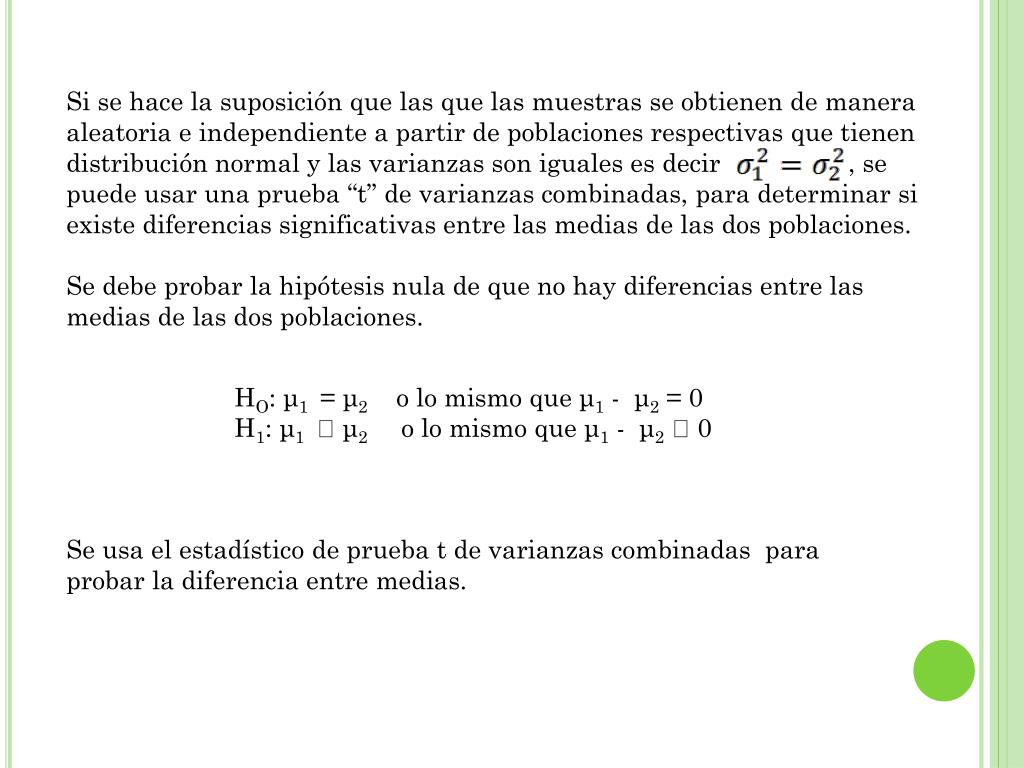 Si se hace la suposición que las que las muestras se obtienen de manera aleatoria e independiente a partir de poblaciones respectivas que tienen distribución normal y las varianzas son iguales es decir , se puede usar una prueba “t” de varianzas combinadas, para determinar si existe diferencias significativas entre las medias de las dos poblaciones. Se debe probar la hipótesis nula de que no hay diferencias entre las medias de las dos poblaciones. HO: μ1 = μ2 o lo mismo que μ1 - μ2 = 0 H1: μ1 μ2 o lo mismo que μ1 - μ2 0 Se usa el estadístico de prueba t de varianzas combinadas para probar la diferencia entre medias.