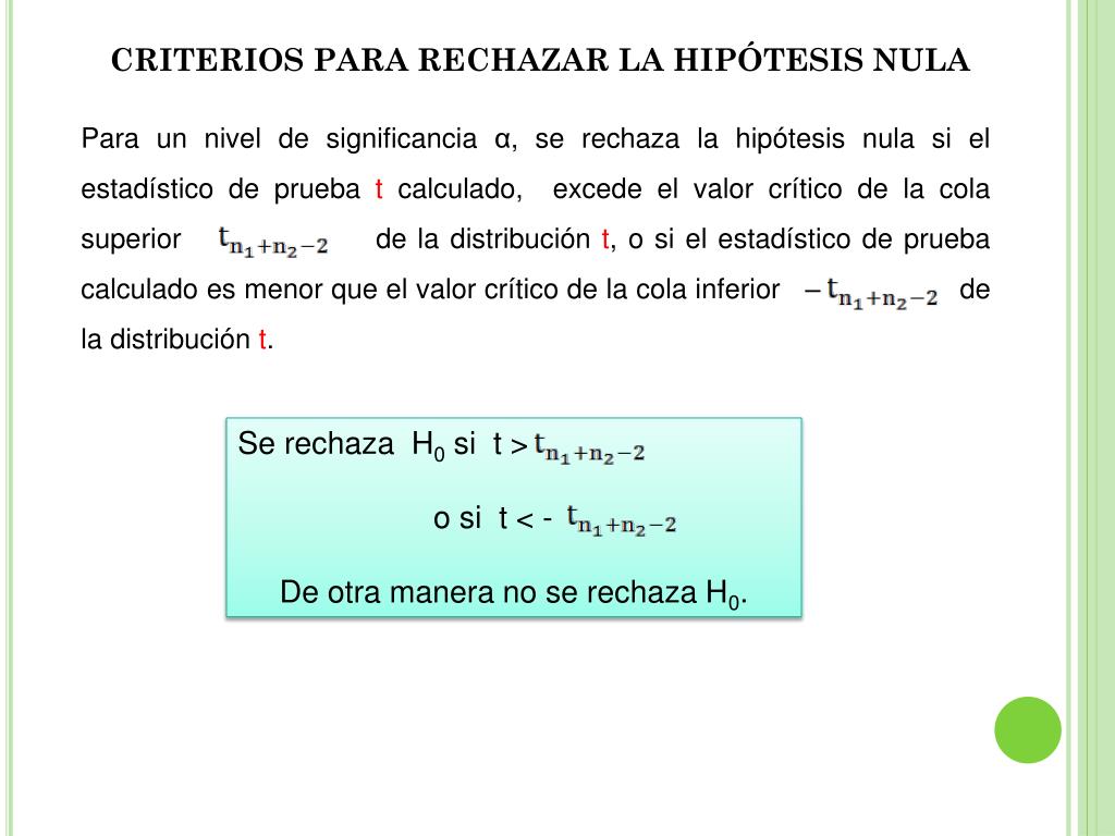 CRITERIOS PARA RECHAZAR LA HIPÓTESIS NULA Para un nivel de significancia α, se rechaza la hipótesis nula si el estadístico de prueba t calculado, excede el valor crítico de la cola superior de la distribución t, o si el estadístico de prueba calculado es menor que el valor crítico de la cola inferior – de la distribución t. Se rechaza H0 si t > o si t < - De otra manera no se rechaza H0.