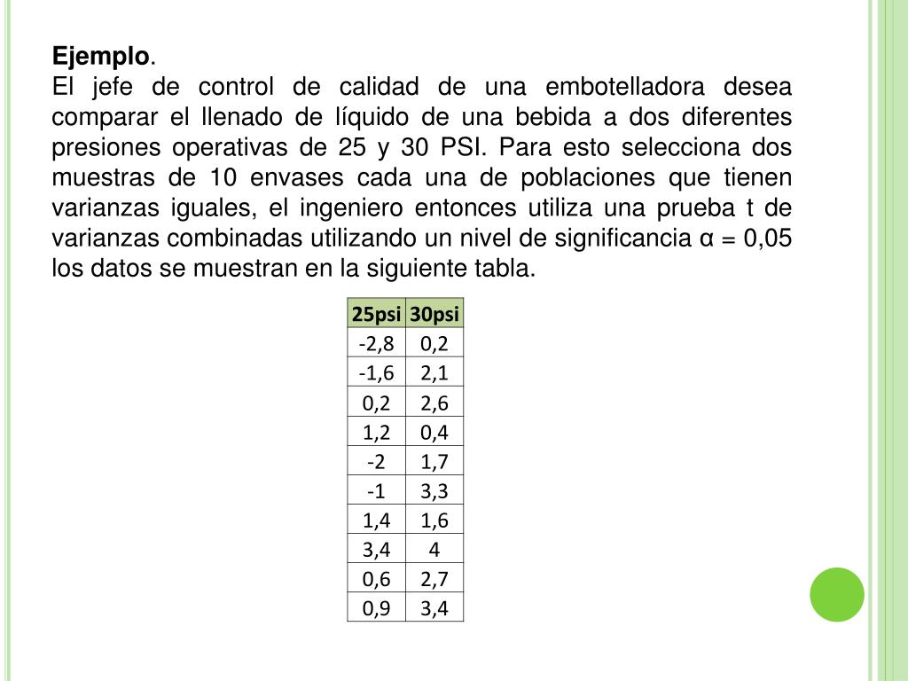 Ejemplo. El jefe de control de calidad de una embotelladora desea comparar el llenado de líquido de una bebida a dos diferentes presiones operativas de 25 y 30 PSI. Para esto selecciona dos muestras de 10 envases cada una de poblaciones que tienen varianzas iguales, el ingeniero entonces utiliza una prueba t de varianzas combinadas utilizando un nivel de significancia α = 0,05 los datos se muestran en la siguiente tabla.