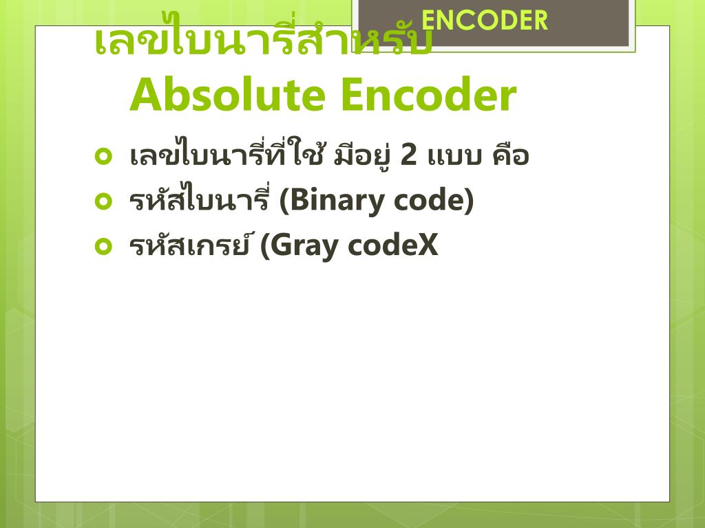 ENCODER เลขไบนารี่สำหรับ Absolute Encoder • เลขไบนารี่ที่ใช้ มีอยู่ 2 แบบ คือ • รหัสไบนารี่ (Binary code) • รหัสเกรย์(Gray codeX