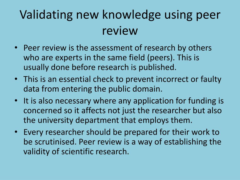 Validating new knowledge using peer review • Peer review is the assessment of research by others who are experts in the same field (peers). This is usually done before research is published. • This is an essential check to prevent incorrect or faulty data from entering the public domain. • It is also necessary where any application for funding is concerned so it affects not just the researcher but also the university department that employs them. • Every researcher should be prepared for their work to be scrutinised. Peer review is a way of establishing the validity of scientific research.