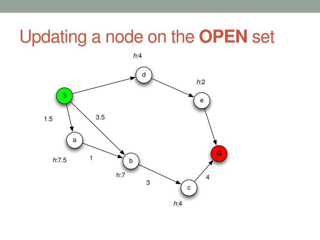 Algorithm • Initialize CLOSED list to an empty list • Add start onto the OPEN list • while open is not empty • Select node n from the OPEN list with minimum f(n) • Add n to the CLOSED list • ifn is equal to the goal state • return the path found from backtracking • for each neighbor n’ of n • Compute g(n’) = g(n) + c(n, n’) • if n’ is on the open and has cost greater than g(n’) • Remove n’ from the open list, update f(n’), add back to OPEN list • Set parent of n’ to be n • ifn’ is on the closed list and has cost greater than g(n’) • Remove n’ from the closed list, update f(n’), add back to OPEN list • Set parent of n’ to be n • if n’ is not on the OPEN list or the CLOSED list • Compute h(n’), f(n’) = g(n’) + h(n’) • Put n’ onto the open list • Set parent of n’ to be n • return failure