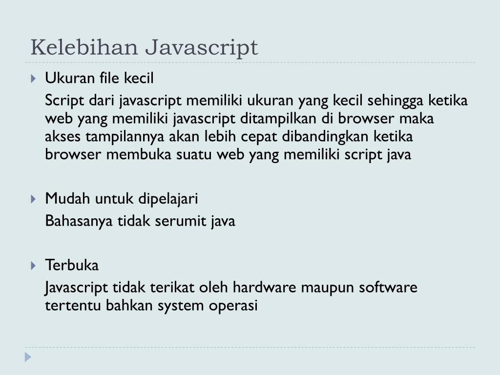 KelebihanJavascript • Ukuran file kecil Script darijavascriptmemilikiukuran yang kecilsehinggaketika web yang memilikijavascriptditampilkandi browser makaaksestampilannyaakanlebihcepatdibandingkanketika browser membukasuatu web yang memiliki script java • Mudahuntukdipelajari Bahasanyatidakserumit java • Terbuka Javascripttidakterikatoleh hardware maupun software tertentubahkan system operasi
