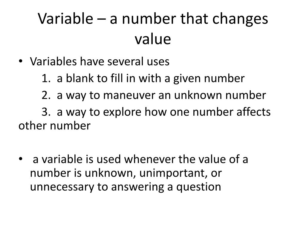 Variable – a number that changes value • Variables have several uses 1. a blank to fill in with a given number 2. a way to maneuver an unknown number 3. a way to explore how one number affects other number • a variable is used whenever the value of a number is unknown, unimportant, or unnecessary to answering a question