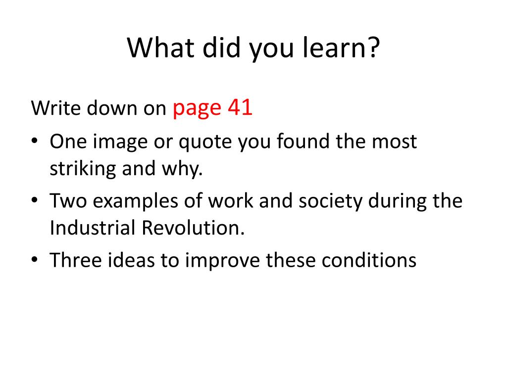 What did you learn? Write down on page 41 • One image or quote you found the most striking and why. • Two examples of work and society during the Industrial Revolution. • Three ideas to improve these conditions