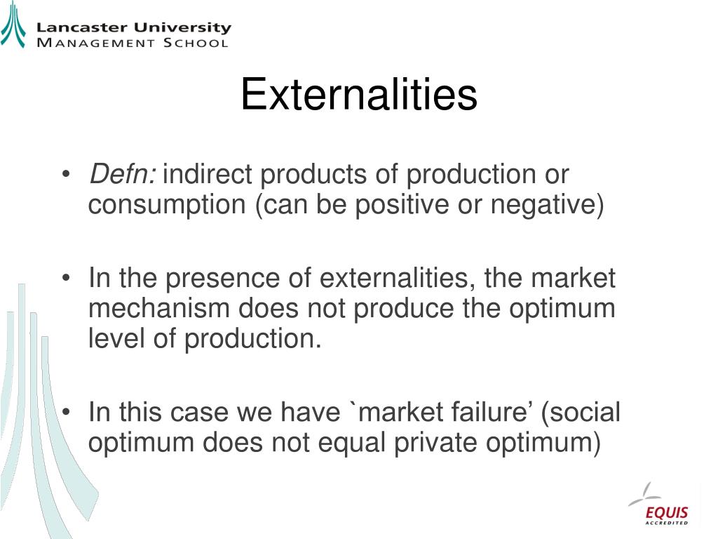 Externalities • Defn: indirect products of production or consumption (can be positive or negative) • In the presence of externalities, the market mechanism does not produce the optimum level of production. • In this case we have `market failure’ (social optimum does not equal private optimum)