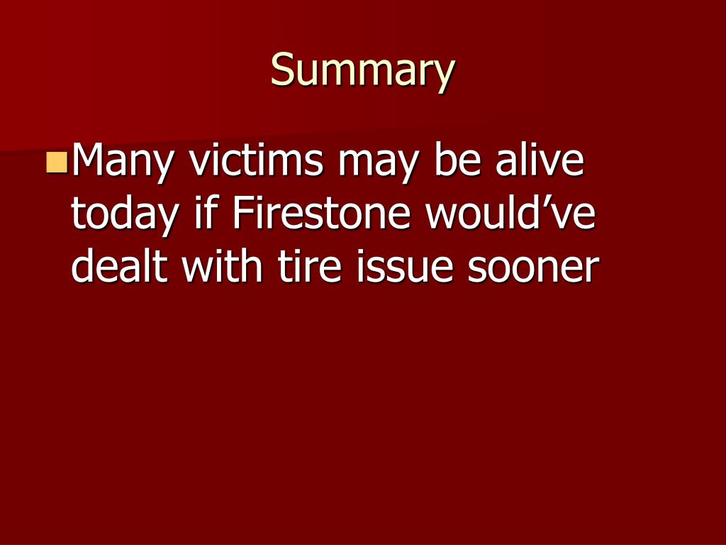 Summary • Many victims may be alive today if Firestone would’ve dealt with tire issue sooner