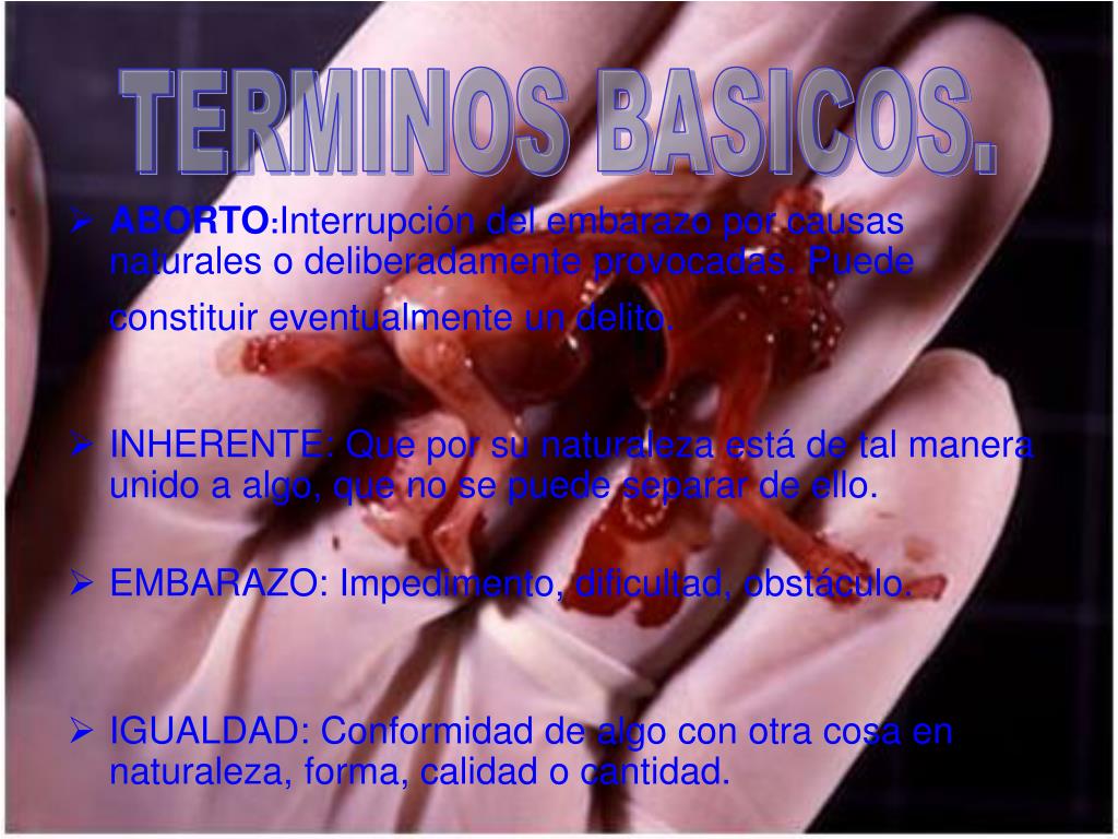 TERMINOS BASICOS. • ABORTO:Interrupción del embarazo por causas naturales o deliberadamente provocadas. Puede constituir eventualmente un delito. • INHERENTE: Que por su naturaleza está de tal manera unido a algo, que no se puede separar de ello. • EMBARAZO: Impedimento, dificultad, obstáculo. • IGUALDAD: Conformidad de algo con otra cosa en naturaleza, forma, calidad o cantidad.