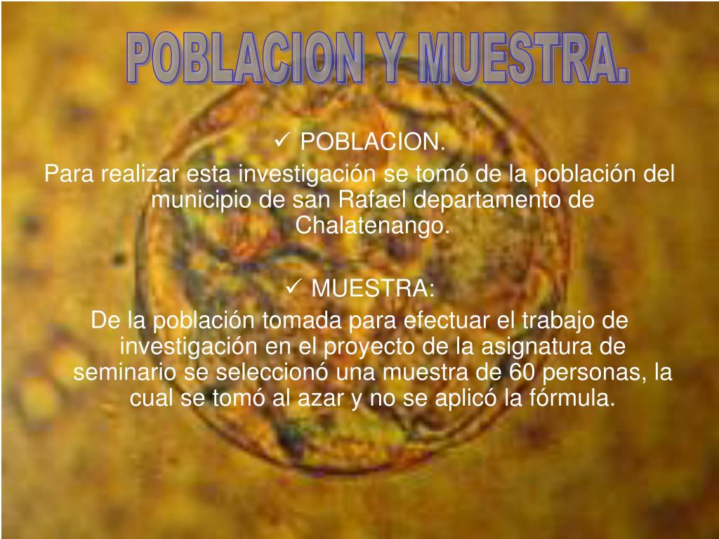 POBLACION Y MUESTRA. • POBLACION. Para realizar esta investigación se tomó de la población del municipio de san Rafael departamento de Chalatenango. • MUESTRA: De la población tomada para efectuar el trabajo de investigación en el proyecto de la asignatura de seminario se seleccionó una muestra de 60 personas, la cual se tomó al azar y no se aplicó la fórmula.