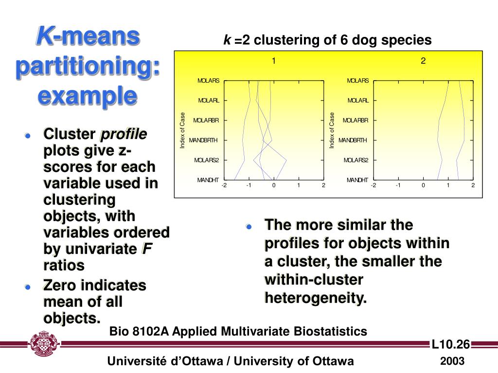 K-means partitioning: example k =2 clustering of 6 dog species • Cluster profile plots give z-scores for each variable used in clustering objects, with variables ordered by univariate F ratios • Zero indicates mean of all objects. • The more similar the profiles for objects within a cluster, the smaller the within-cluster heterogeneity. Bio 8102A Applied Multivariate Biostatistics