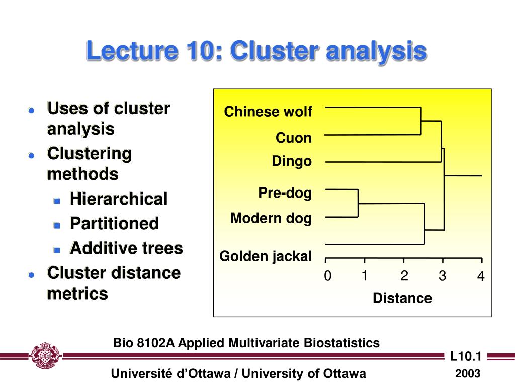 Uses of cluster analysis Clustering methods Hierarchical Partitioned Additive trees Cluster distance metrics. Chinese wolf. Cuon. Dingo. Pre-dog. Modern dog. Golden jackal. 0. 1. 2. 3. 4. Distance. Lecture 10: Cluster analysis.