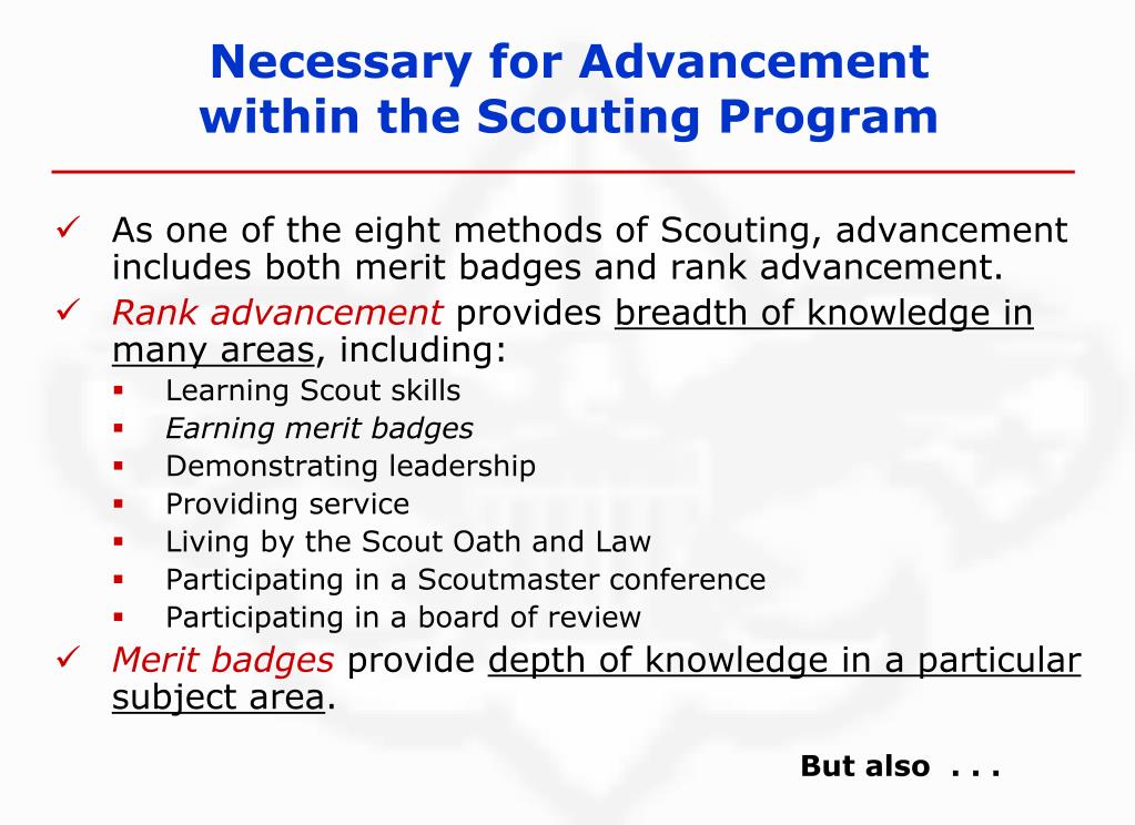 Necessary for Advancement within the Scouting Program • As one of the eight methods of Scouting, advancement includes both merit badges and rank advancement. • Rank advancement provides breadth of knowledge in many areas, including: • Learning Scout skills • Earning merit badges • Demonstrating leadership • Providing service • Living by the Scout Oath and Law • Participating in a Scoutmaster conference • Participating in a board of review • Merit badges provide depth of knowledge in a particular subject area. But also . . .