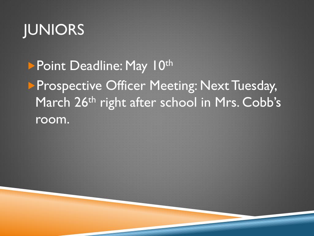 Juniors • Point Deadline: May 10th • Prospective Officer Meeting: Next Tuesday, March 26th right after school in Mrs. Cobb’s room.