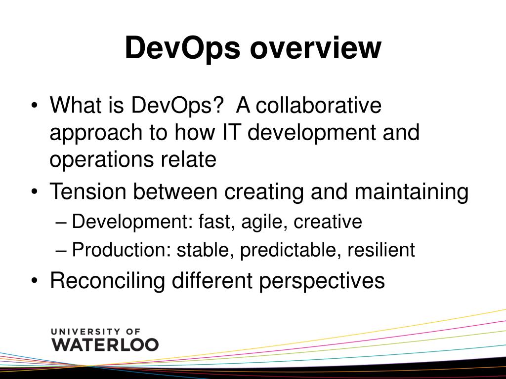 DevOps overview • What is DevOps? A collaborative approach to how IT development and operations relate • Tension between creating and maintaining • Development: fast, agile, creative • Production: stable, predictable, resilient • Reconciling different perspectives