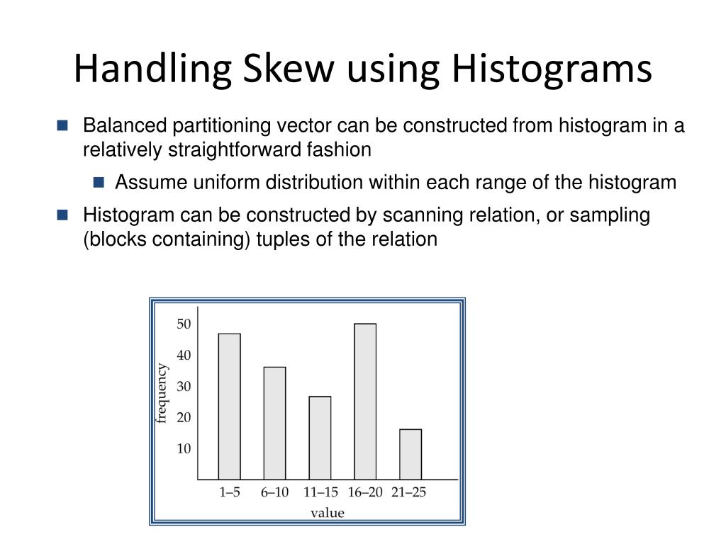 Handling Skew using Histograms • Balanced partitioning vector can be constructed from histogram in a relatively straightforward fashion • Assume uniform distribution within each range of the histogram • Histogram can be constructed by scanning relation, or sampling (blocks containing) tuples of the relation