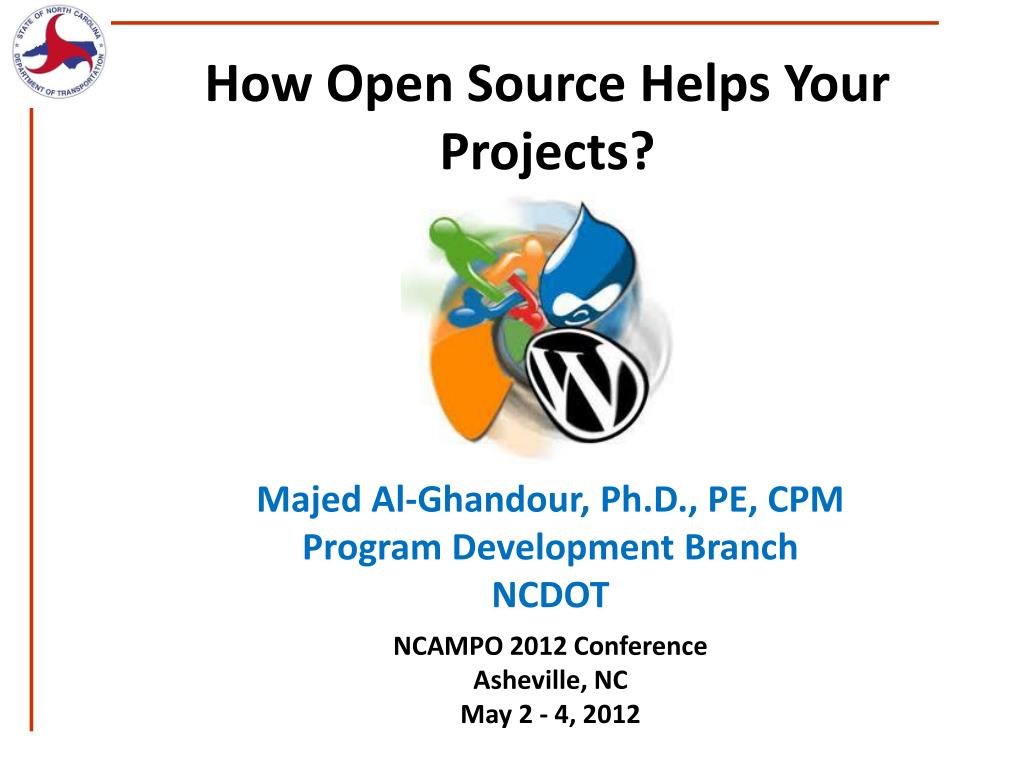 How Open Source Helps Your Projects? • Majed Al-Ghandour, Ph.D., PE, CPM • Program Development Branch • NCDOT • NCAMPO 2012 Conference • Asheville, NC • May 2 - 4, 2012